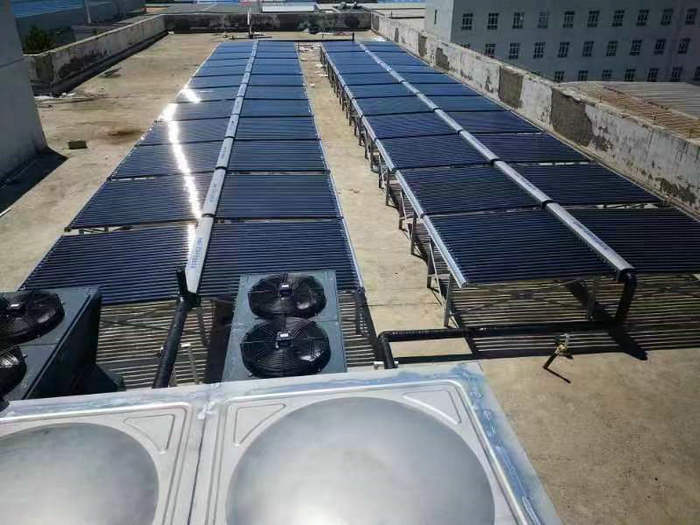 天津東馬圈雍福悅園區工廠宿舍熱水系統為12噸的熱水項目:采用了兩臺10P空氣能低溫機(ZN-DKFDX-120ll)十24組太陽能集熱器(58*1800*50)+12噸方形不銹鋼熱水保溫水箱。